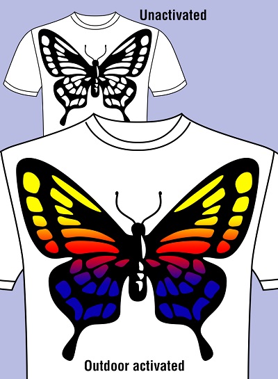 When used in textile ink printed onto clothing garments such as t shirts, the change to color when exposed to sunlight occurs within 15 seconds or less, and returns to a near invisible clear shade after 5 minutes or less indoors when removed from the uv/sunlight.